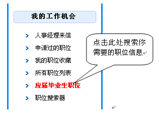 注意:如果你是應(yīng)屆畢業(yè)生可以進(jìn)入"個人管理中心",位于左側(cè)子欄目的"我的工作機(jī)會",點擊"應(yīng)屆畢業(yè)生職位"如下圖所示: